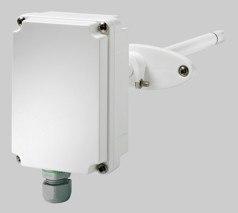 Temp- och fuktgivare för kanalmontage. Lämnar 0..10V för temp (-40..60°C) och fukt (0..100%RH).